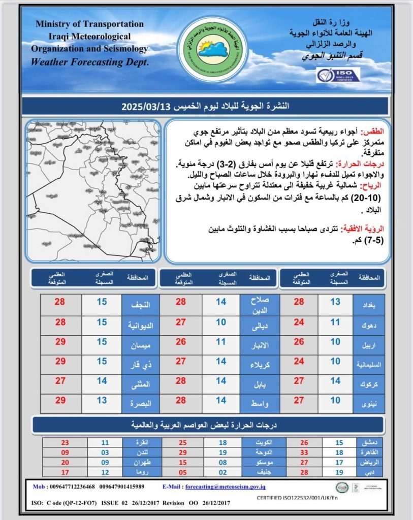 أعلنت هيئة الأنواء الجوية، اليوم الخميس ، عن حالة الطقس في البلاد فيما توقعت أجواء ربيعية تسود معظم المدن، بتأثير مرتفع جوي فوق تركيا، وارتفاع إضافي على درجات الحرارة حيث تلامس 30 درجة في بعض المحافظات.