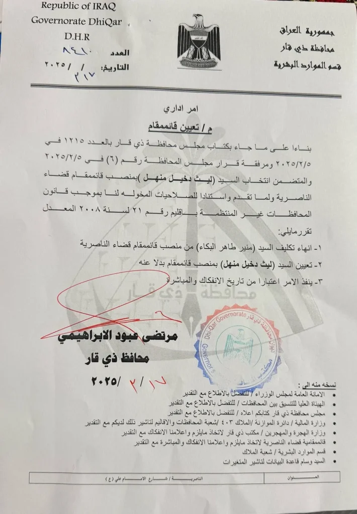 بالوثيقة.. انهاء تكليف منير طاهر البكاء من منصب قائممقام الناصرية