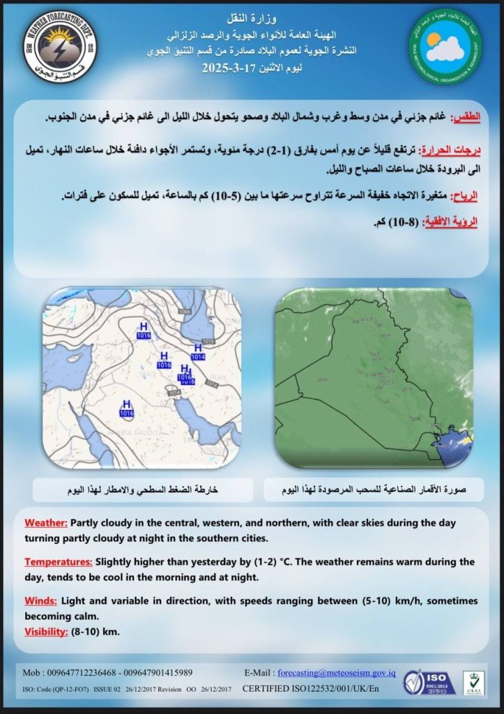 شهدت مناطق وسط وغرب وشمال البلاد ،اليوم الإثنين ،طقساً غائماً جزئياً، بينما تحولت الأجواء في مدن الجنوب إلى غائم جزئي خلال ساعات الليل، كما سجلت درجات الحرارة ارتفاعاً طفيفاً يتراوح بين درجة إلى درجتين مئويتين مقارنةً بيوم أمس.