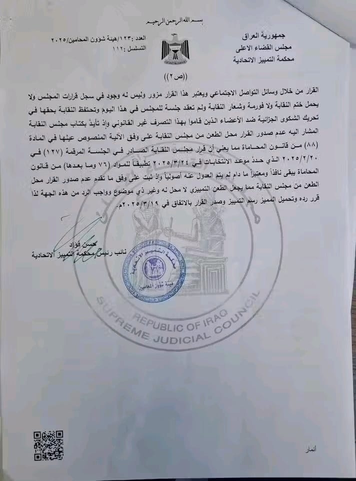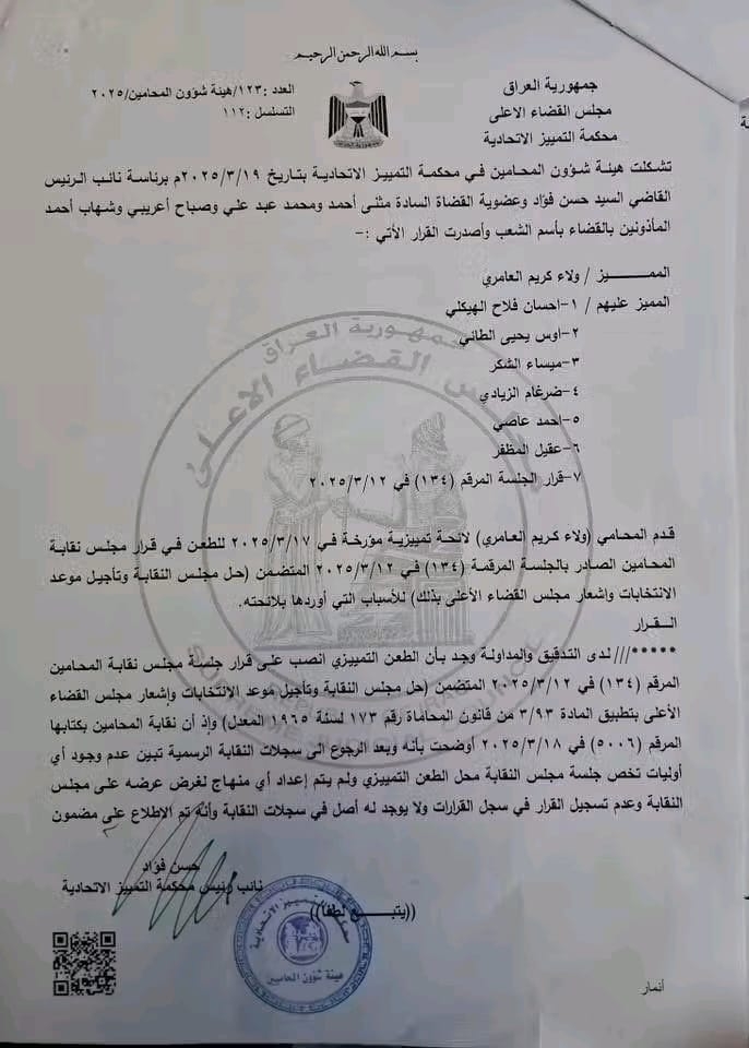 أكدت محكمة التمييز الاتحادية، اليوم الأربعاء ، أن قرار بعض أعضاء مجلس نقابة المحامين بحل المجلس وتأجيل الانتخابات “مزور”.