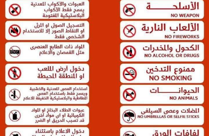 وتشمل قائمة المواد المحظورة، وفق البيان، “الأسلحة والأدوات الحادة، والمواد القابلة للكسر، والألعاب النارية، والمشروبات الكحولية، والمخدرات، والشعارات العنصرية أو السياسية، وساريات الأعلام الطويلة، والحيوانات”.