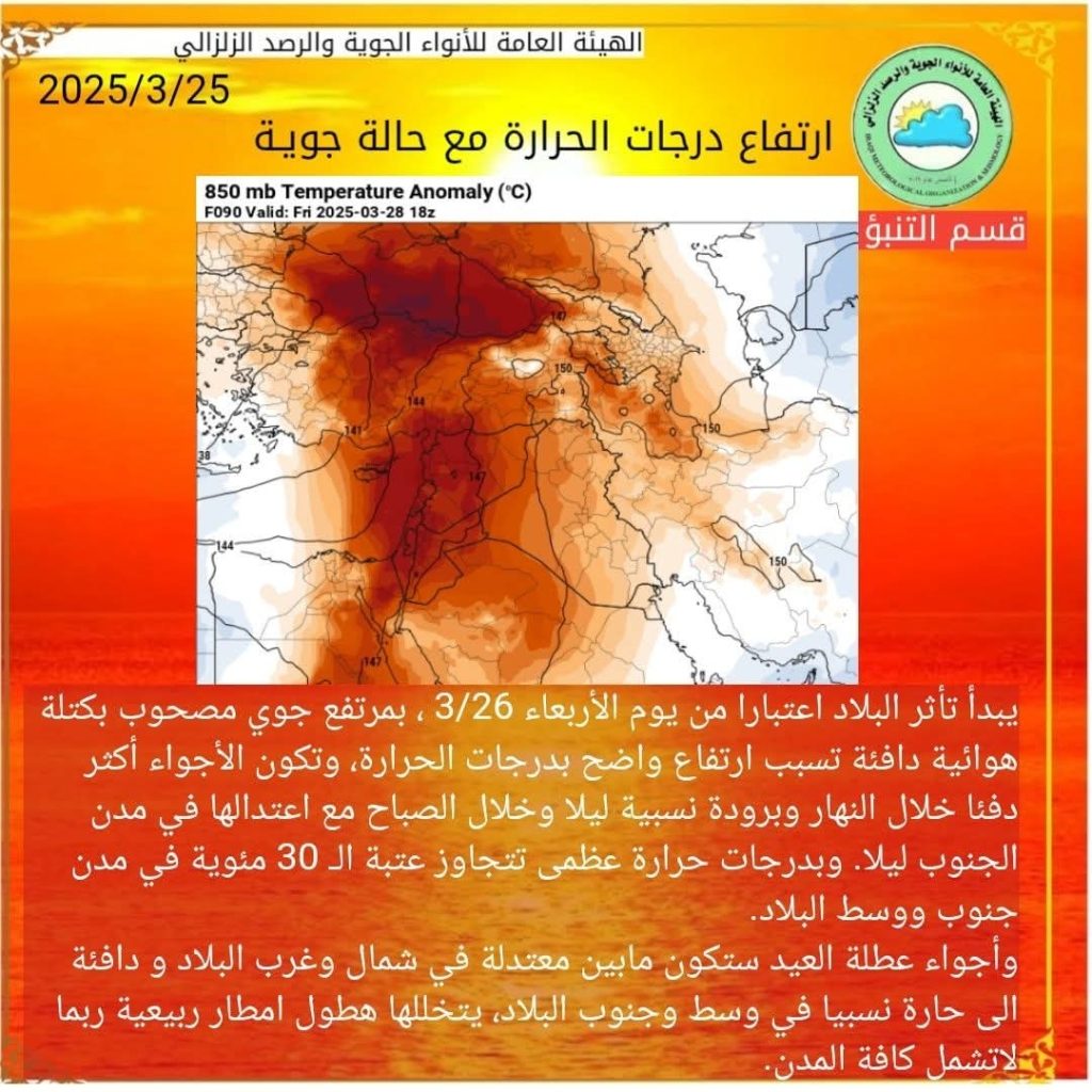 أعلنت الهيئة العامة للأنواء الجوية، اليوم الثلاثاء ، عن حالة الطقس بعموم البلاد، متوقعة أجواء دافئة خلال النهار تسببها كتلة هوائية مع ارتفاع بدرجات حرارة وبرودة نسبية في الليل بدرجات حرارة تتجاوز عتبة الـ 30 مئوية في وسط وجنوب البلاد، مبينة ان أجواء العيد ستكون معتدلة في شمال وغرب البلاد فيما ستكون دافئة الى حارة نسبيا في وسطه وجنوبه مع فرصة لهطول أمطار ربيعية.