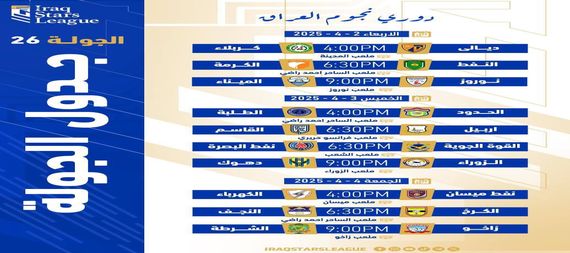 الاعلان عن مواعيد الجولة 26 من دوري نجوم العراق