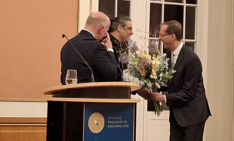 وتسلم الكاتب جائزته التي تبلغ قيمتها 30 ألف يورو، خلال حفل أقيم في قاعة المدينة الحمراء، بحضور عمدة برلين، ورئيس المجلس البلدي، وشخصيات أدبية.