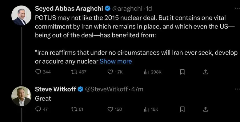 وكتب عباس عراقجي في منشوره: “التعامل الدبلوماسي أثبت فاعليته في الماضي؛ ولا يزال بإمكانه أن يكون مجدياً.” وقد لقيت هذه الرسالة، التي أكدت على إمكانية استمرار المسار الدبلوماسي، رداً غير متوقع من ستيف ويتكوف، المبعوث الخاص لترامب في الشرق الأوسط.