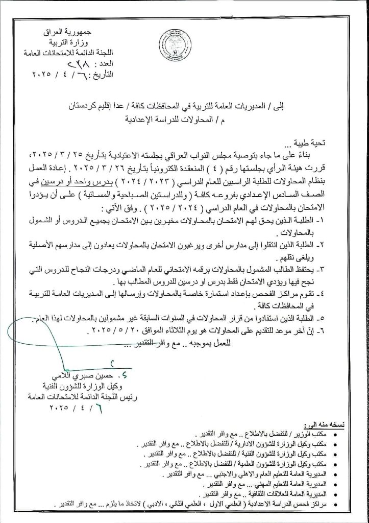 أصدرت وزارة التربية ،اليوم الاحد ، عن طريق اللجنة الدائمة للامتحانات العامة، ضوابط وتعليمات إعادة العمل بنظام المحاولات للطلبة الراسبين في العام الدراسي ٢٠٢٣/٢٠٢٤.