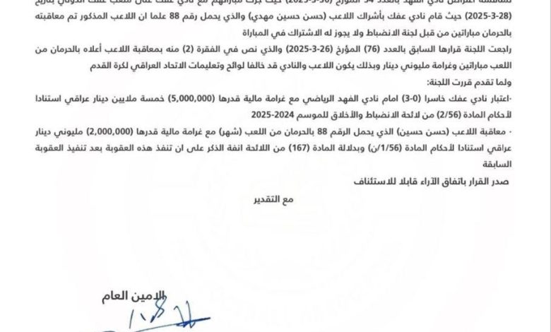 كما فرضت اللجنة عقوبة مالية على نادي عفك، قدرها 5 ملايين دينار، بسبب السماح للاعب بالمشاركة رغم عقوبته السابقة، بالإضافة إلى ذلك، قررت اللجنة حرمان اللاعب من تمثيل الفريق لمدة شهر مع فرض غرامة مالية قدرها مليون دينار، نتيجة تجاوزه اللوائح والتعليمات الخاصة بالاتحاد.