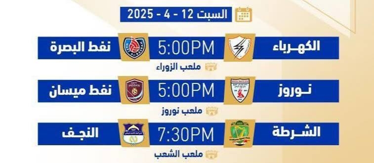 ووفق جدول نشره الاتحاد اطلعت “وطن نيوز” عليه يشير الى انه “تجمع أولى المباريات فريق الكهرباء وضيفه نفط البصرة على ملعب الزوراء في الساعة الخامسة مساءً، فيما يلتقي بنفس التوقيت فريق نوروز ونفط ميسان في المباراة التي يضيفها ملعب نوروز”.