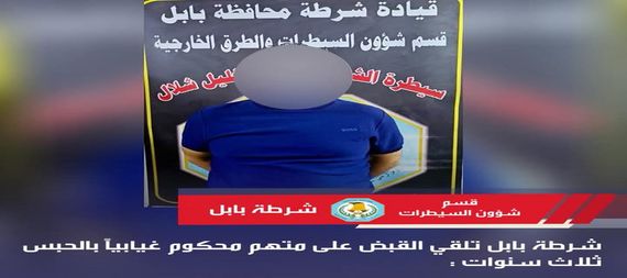 القت مفارز سيطرة الشهيد العقيد خليل شلال التابعة لقيادة شرطة محافظة بابل القبض على متهم مطلوب قضائياً بموجب أحكام المادة 459 من قانون العقوبات ، وصادر بحقه حكم غيابي بالحبس ثلاث سنوات .