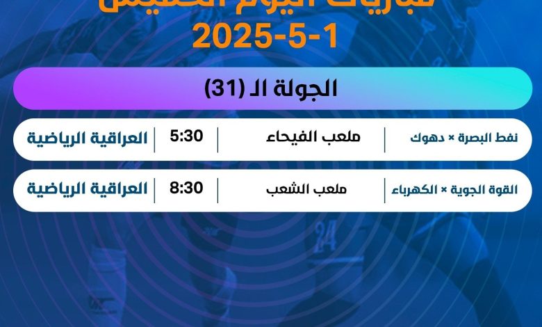 تنطلق اليوم الخميس، منافسات الجولة الـ31 من دوري نجوم العراق لمحترفي كرة القدم، بإقامة مواجهتين بارزتين، تتصدرهما مباراة القوة الجوية والكهرباء التي يحتضنها ملعب الشعب الدولي عند الساعة الثامنة والنصف مساءً.