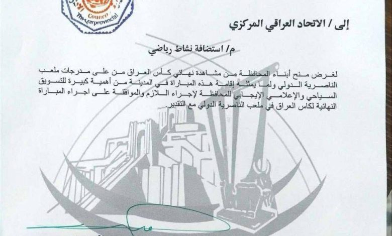 قدم مجلس محافظة ذي قار، طلبا رسميا الى اتحاد الكرة ، لغرض استضافة مباراة نهائي بطولة كأس العراق 2025 على ملعب الناصرية الدولي.