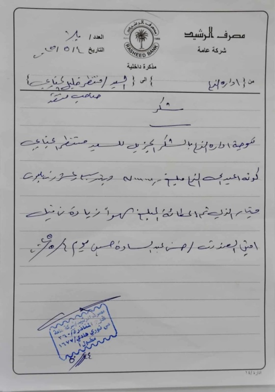 وحسب وثيقة تلقتها “وطن نيوز” فإن مصرف الرشيد وجه كتاب شكر للجنابي تقديرا لأمانته وضميره الحي.