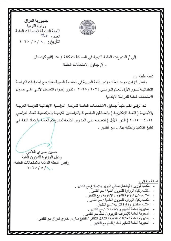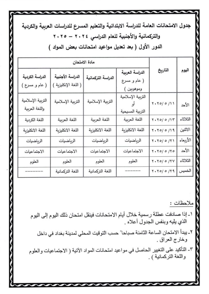 اجرت وزارة التربية، اليوم الاحد ، تعديلا على جدول امتحانات الدراسة الابتدائية نظرا لتزامن موعد انعقاد مؤتمر القمة العربية في العاصمة بغداد.
