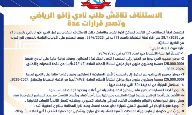 ناقشت لجنةُ الاستئناف في الاتحاد العراقيّ لكرةِ القدم اليوم الاثنين (12 أيار 2025)، طلب الاستئناف المقدم من نادي زاخو الرياضي بالعدد (215) بتاريخ 28/4/2025، على قرار لجنة الانضباط بالعدد (113ب) في التاريخ نفسه، وقررت قبوله شكلياً.