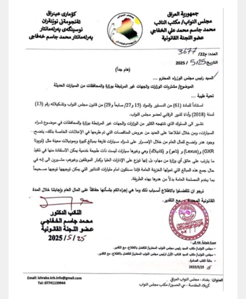 الرئيسية/اخبـار العراق/بالوثيقة.. نائب يفتح ملف شراء السيارات الفارهة في الوزارات الحكومية اخبـار العراق بالوثيقة.. نائب يفتح ملف شراء السيارات الفارهة في الوزارات الحكومية 2025-05-28 53 2025-05-28 53 شاركها فيسبوك X لينكدإن Tumblr بينتيريست Reddit VKontakte Odnoklassniki Pocket مشاركة عبر البريد طباعة