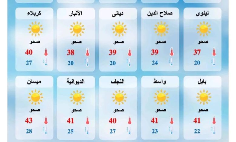 أعلنت هيئة الأنواء الجوية، اليوم السبت، حالة طقس العراق خلال الأيام المقبلة، فيما أشارت إلى أجواء صحو مع انخفاض بالحرارة.
