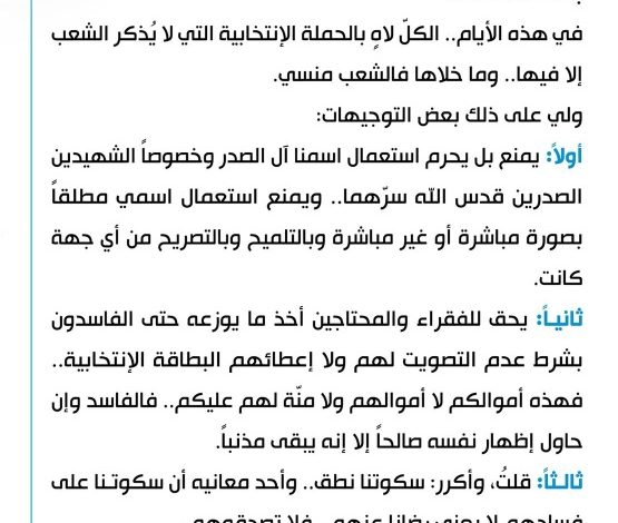 اصدر زعيم التيار الوطني الشيعي مقتدى الصدر ،اليوم السبت، ثلاث فقرات اشبه بالفتوة بخصوص الحملات الانتخابية للمرشحين وكما جاءت في منشوره على منصة “اكس”.
