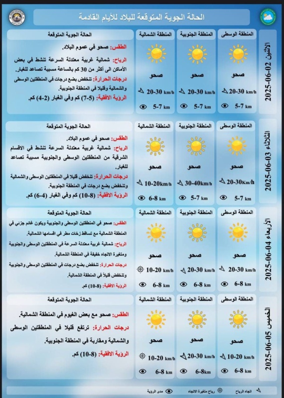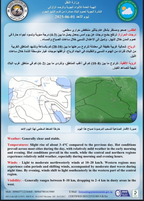 توقعت هيئة الانواء الجوية، اليوم الاحد ، استقرارا باجواء البلاد، حيث يكون الطقس صحوا ومشمسا يرافقه ظهور بعض السحب، بينما ترتفع درجات الحرارة بضع درجات عن يوم امس لتكون حارة نهارا معتدلة ليلا قي المناطق الوسطى والجنوبية.