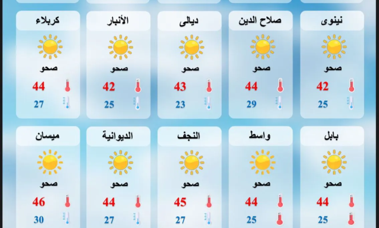 توقعت هيئة الأنواء الجوية، اليوم السبت، بأن يسجل العراق مستويات مرتفعة من الإشعاع الشمسي والحرارة تتجاوز الأربعين مئوية.