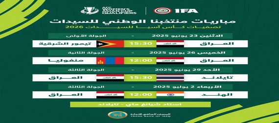 “وطن نيوز” تنشر جدولُ مباريات منتخبنا الوطنيّ للسيدات ضمن المجموعةِ الثانية لتصفيات كأس آسيا التي تقام فيِ مدينة شيانغ ماي التايلاندية، والمؤهلة لنهائياتِ البطولة في أستراليا 2026.