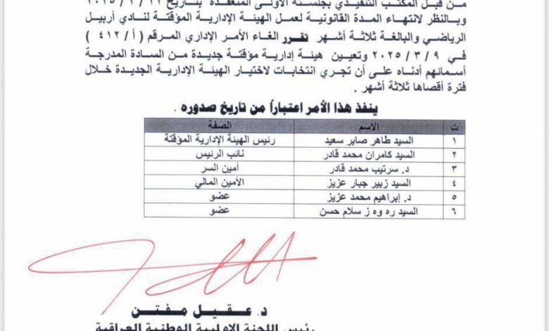 وفي كتاب رسمي حصلت عليه “وطن نيوز” فإن المدة المقررة للهيئة المؤقتة السابقة لنادي اربيل قد انتهت، بعد ان اكملت ثلاثة أشهر ولم تشهد اجراء انتخابات خلال المدة المحددة، وعليه تقرر حلها وتشكيل هيئة مؤقتةً جديدة تقوم بالمهمة.
