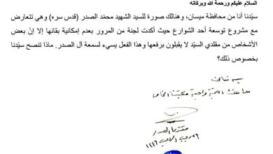 الصدر يرد على سؤال بشأن تعارض صورة لوالده الشهيد مع طريق عام