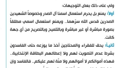 اصدر زعيم التيار الوطني الشيعي مقتدى الصدر ،اليوم السبت، ثلاث فقرات اشبه بالفتوة بخصوص الحملات الانتخابية للمرشحين وكما جاءت في…