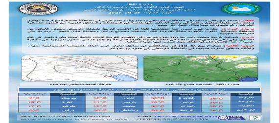توقعت هيئة الانواء الجوية ،اليوم السبت ، ان يكون الطقس ، خلال الايام المقبلة ، صحوا ترافقه بعض السحب في المنطقتين الوسطى والجنوبية، بينما يكون غائما جزئيا في المنطقة الشمالية مع فرص لهطول الامطار، فيما تنخفض درجات الحرارة لتكون الاجواء مائلة للبرودة صباحا وليلا ومعتدلة في النهار.